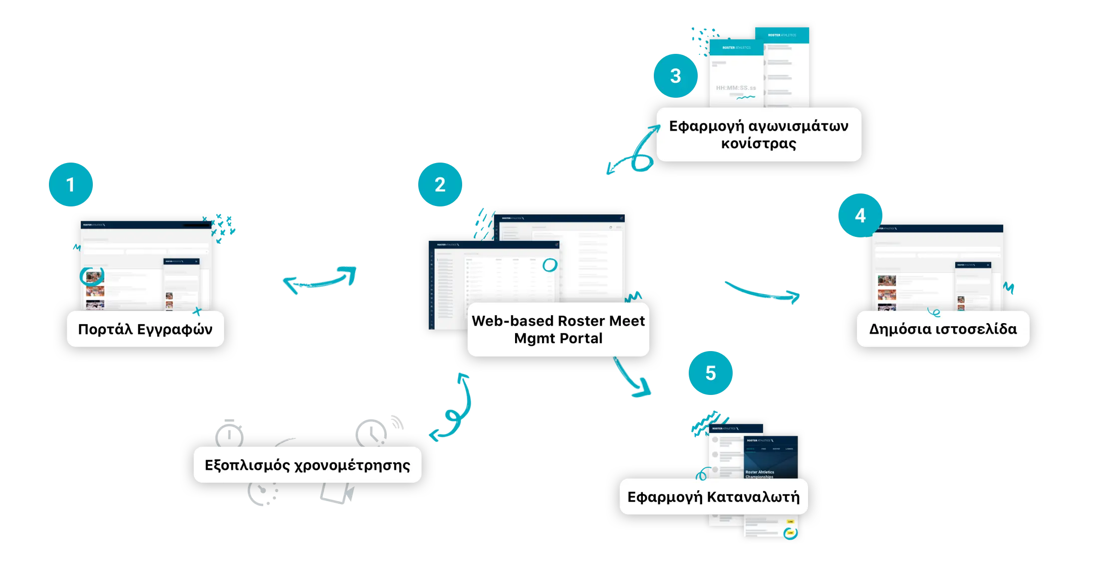 Στην κέντρο του συστήματος Roster Athletics βρίσκεται το Roster Admin Portal. Αυτή η ισχυρή πλατφόρμα αυτοματοποιεί τη ρύθμιση και τη διαχείριση αθλητικών διοργανώσεων, συμπεριλαμβανομένης (i) εγγραφής αθλητών, (ii) προγράμματα αγώνων, λίστες εκκίνησης, αυτοματοποιημένης κλήρωση και προκρίσεις, (iii) αυτοματοποιημένης σύνδεσης με συστήματα χρονομέτρησης για αποτελέσματα, (iv) διαχείριση των χρηστών και (v) αυτόματη μεταφορά δεδομένων στην εφαρμογή Roster Athletics, συμπεριλαμβανομένων όλων των δυνατοτήτων της.