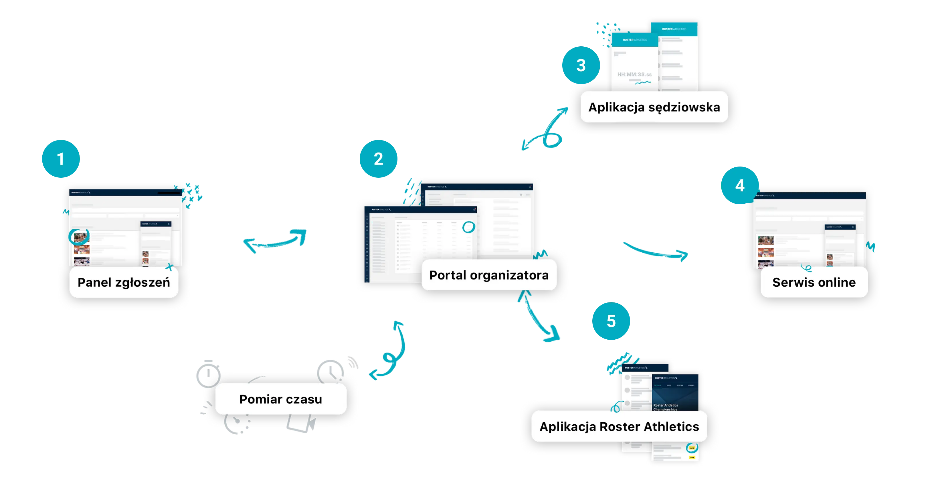 Sercem systemu jest portal administracyjny Roster Athletics. Oferuje on zautomatyzowane rozwiązania związane z organizacją zawodów, w tym m.in. (1) obsługę zgłoszeń i płatności; (2) wybór konkurencji, przygotowanie programu minutowego oraz list startowych, podział na serie i określenie zasad kwalifikacji do kolejnych rund; (3) automatyczną integrację z systemami pomiaru czasu; (4) zarządzanie użytkownikami; oraz (5) integrację z aplikacją mobilną Roster Athletics.
